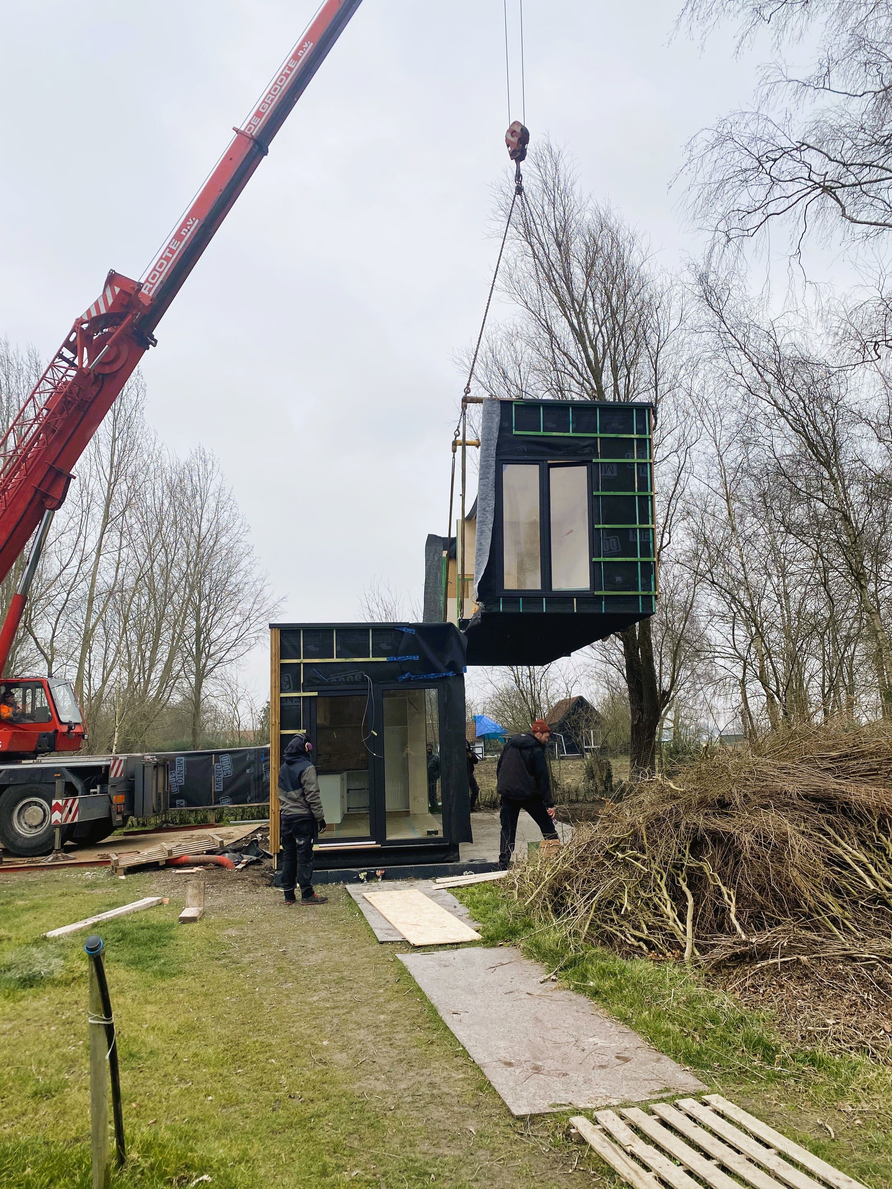 ● Ofwel bouwen we je tiny house op maat, op een stalen frame zonder wielen. Na de afwerking in ons atelier wordt de tiny house vervoerd en met een kraan op de standplaats neergezet. Soms bouwen we ook modules die naast of op elkaar worden geplaatst. Zo kunnen we je tiny house naar wens groter maken. Het stalen frame wordt op paal- of sleuffunderingen geplaatst, of gewoon op blokken. Welke oplossing je ook kiest, je tiny house heeft maar heel weinig impact op de omgeving.