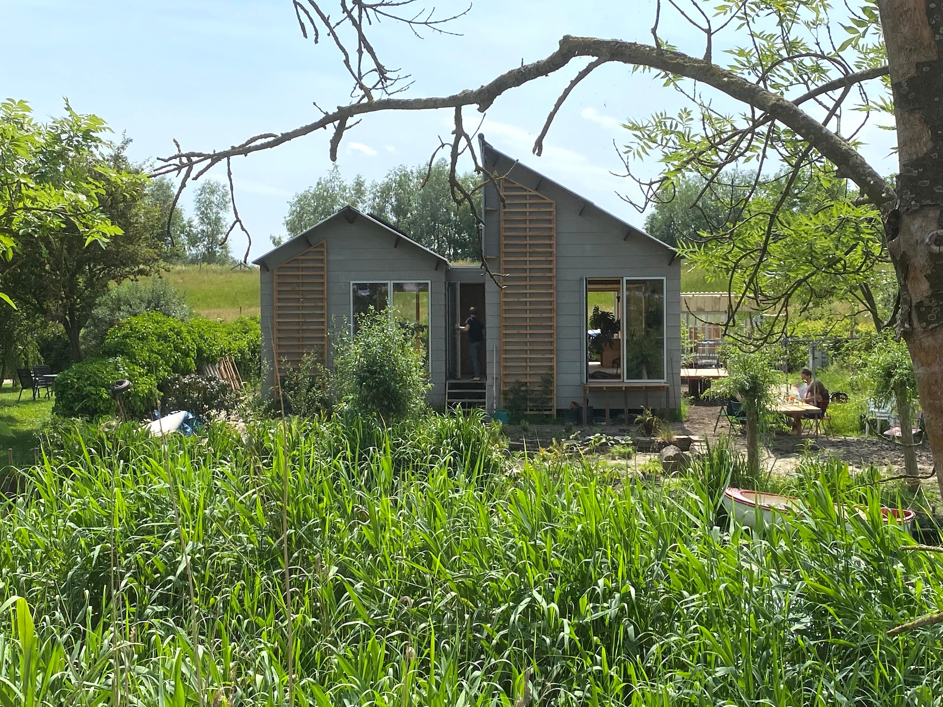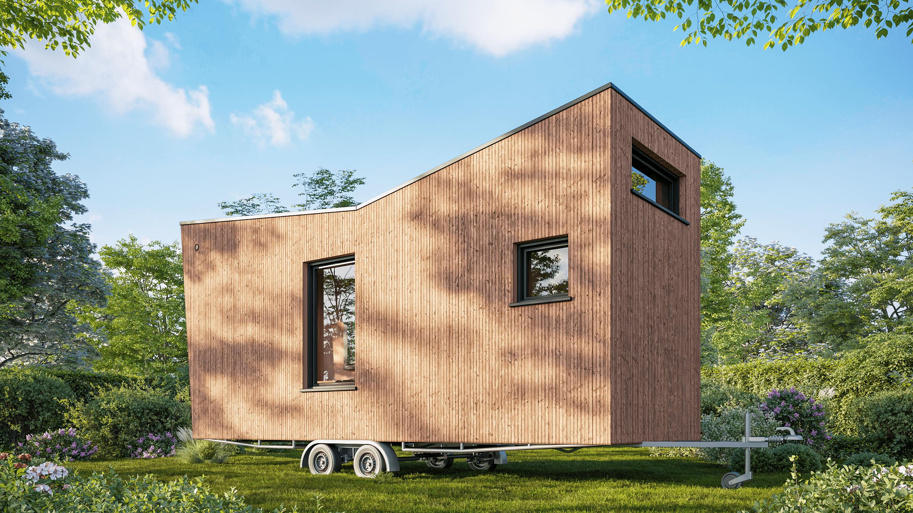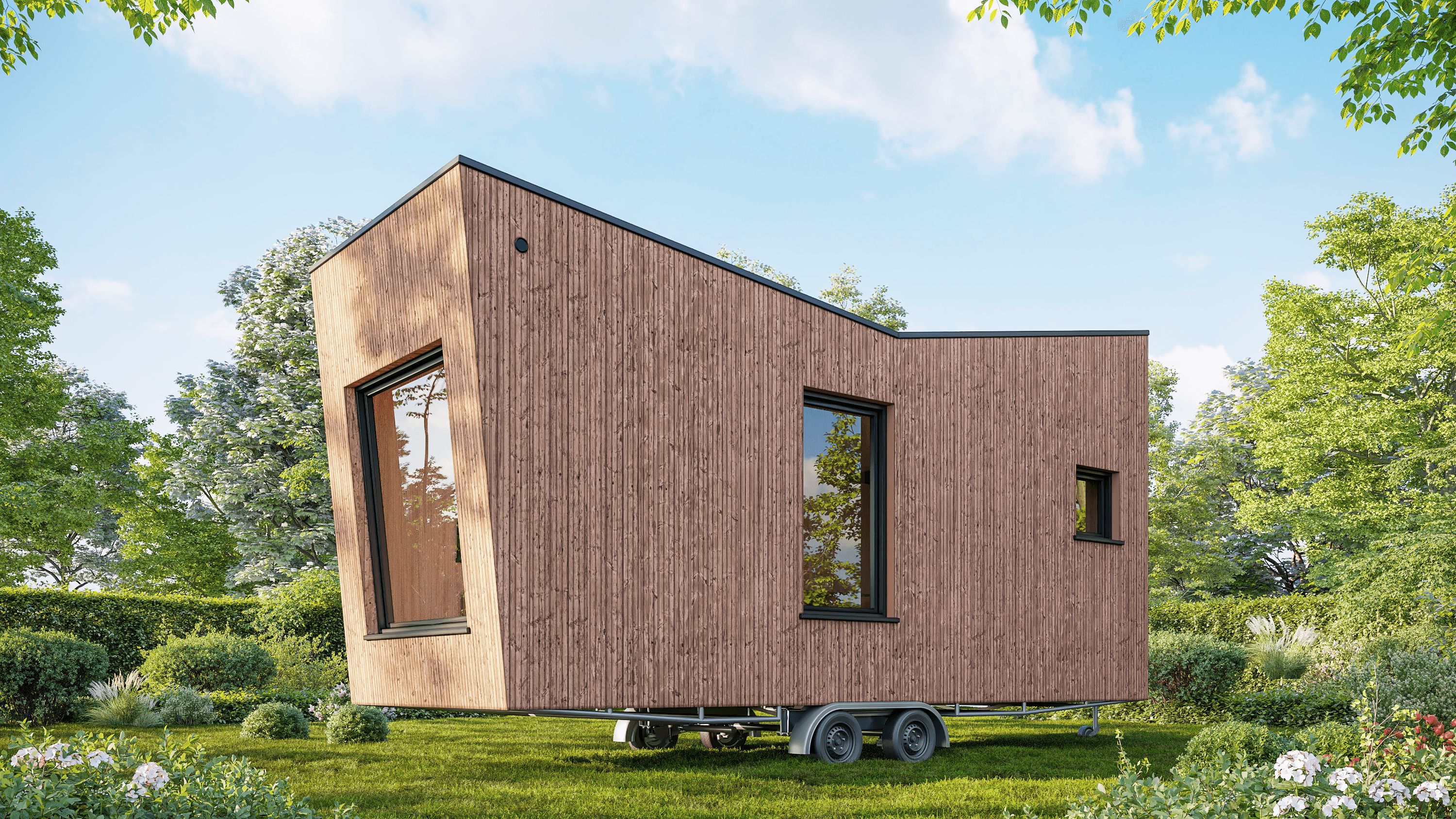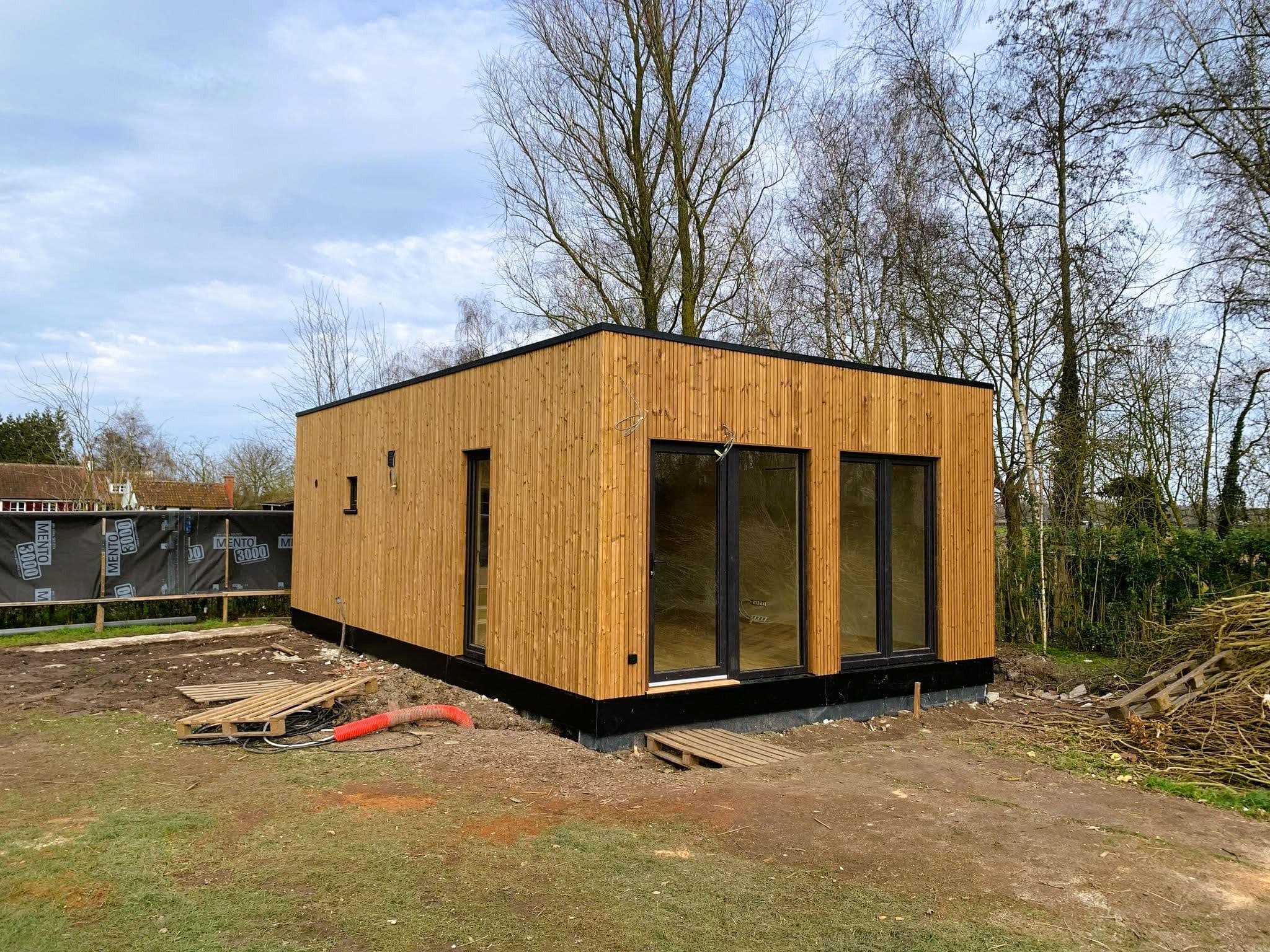 Ook in esthetisch opzicht is deze tiny house een topmodel. De gevel is fraai afgewerkt met verticale thermowood planken, gemonteerd op een stevig dubbel lattenwerk. Een echte aanwinst voor je tuin en de hele buurt.