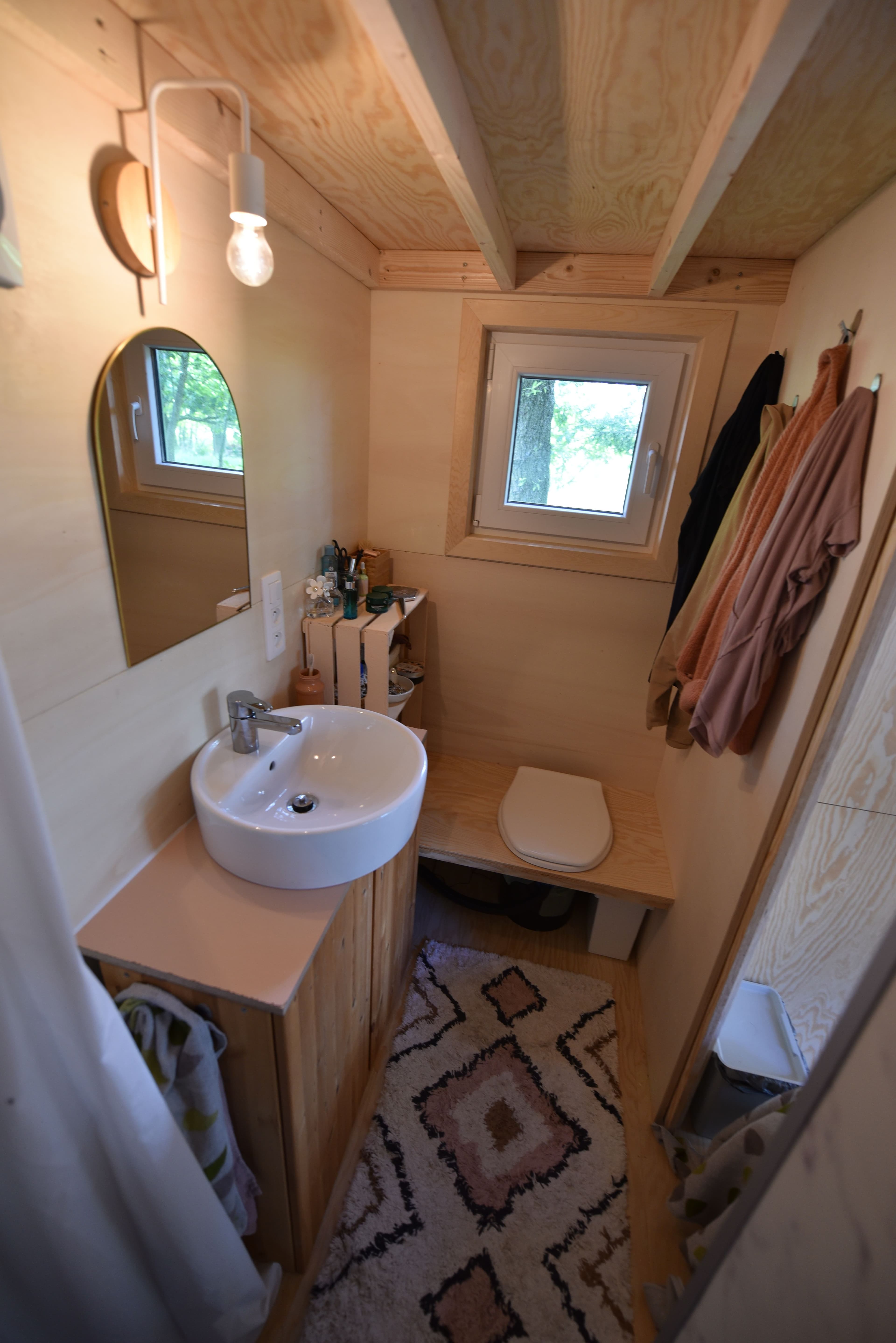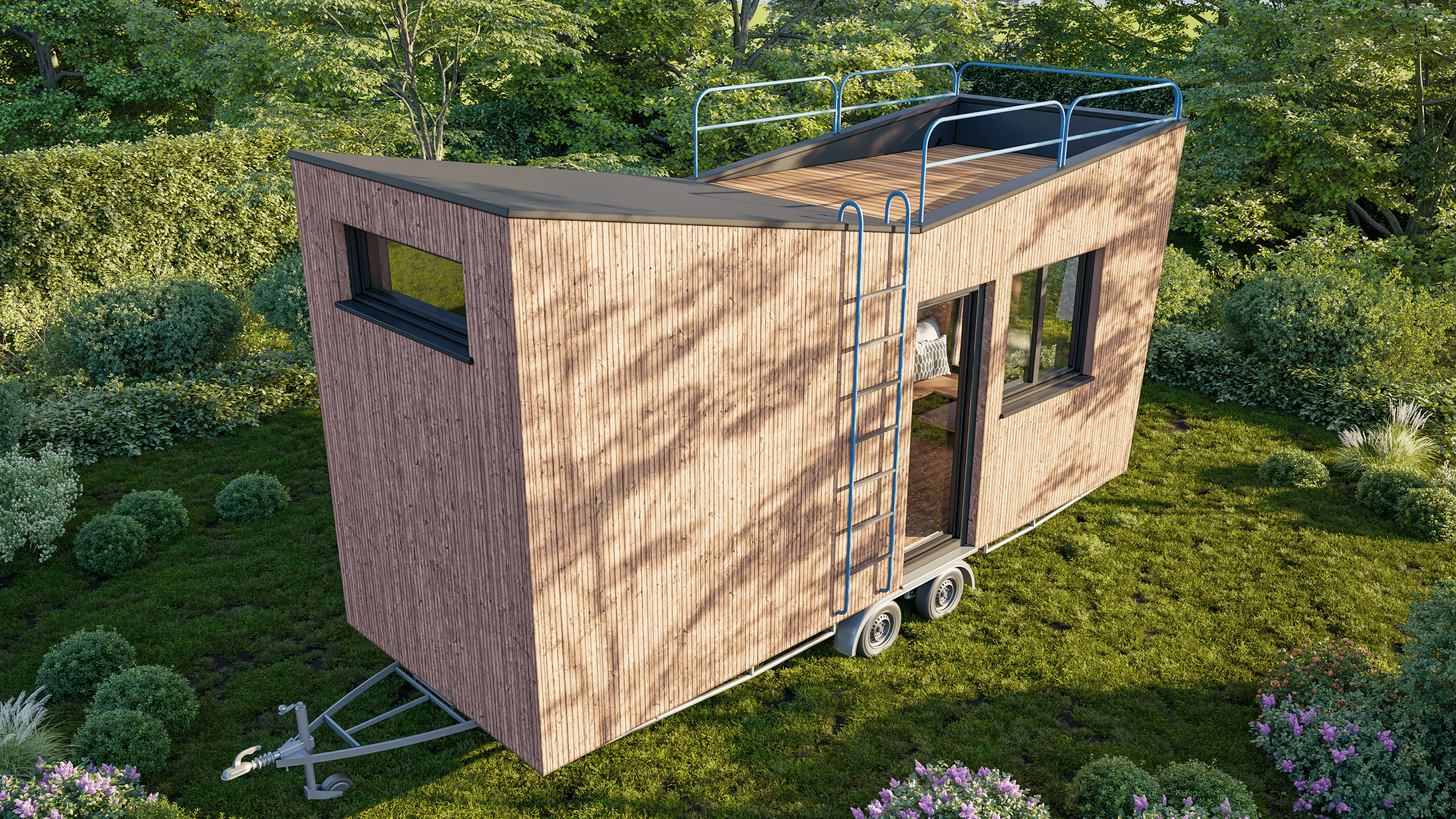 Alle afwerkingen zijn vrij te kiezen, daarenboven kan je verschillende extra opties kiezen: een ladder aan de zijkant van het tiny house die naar een dakterras met balustrade leidt, kussens op maat voor op de zitbank, gordijnbakken, extra kastjes, ....