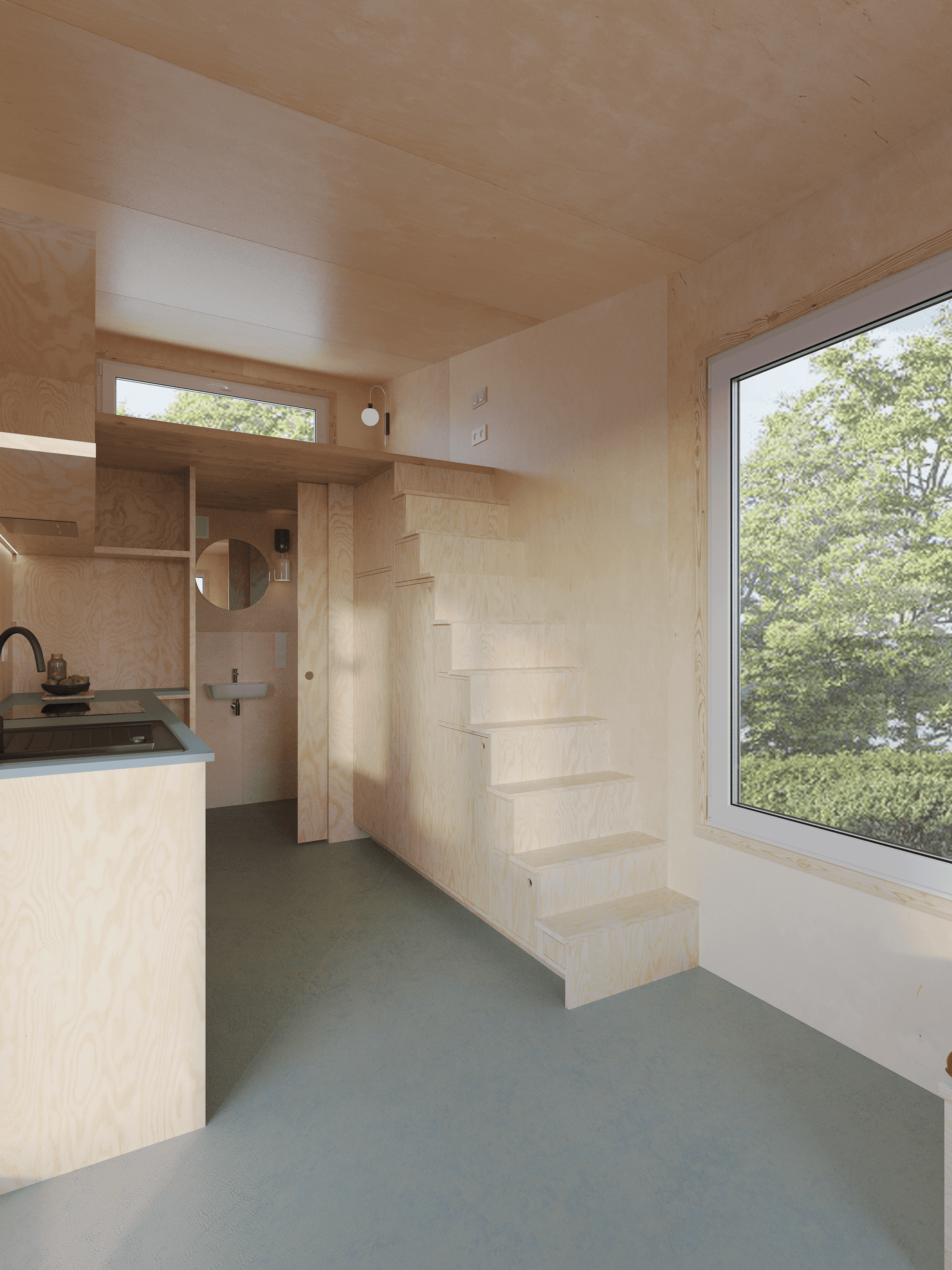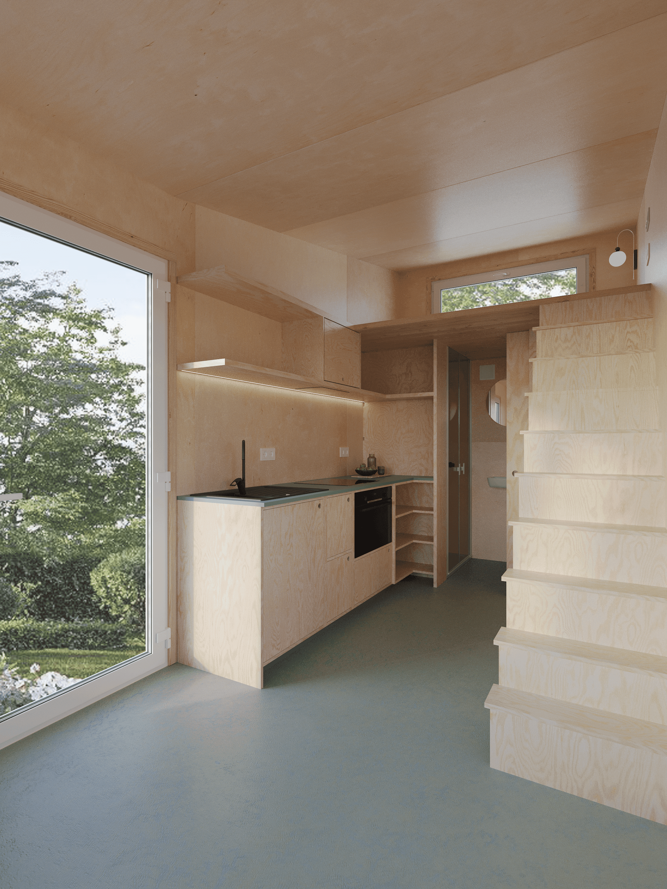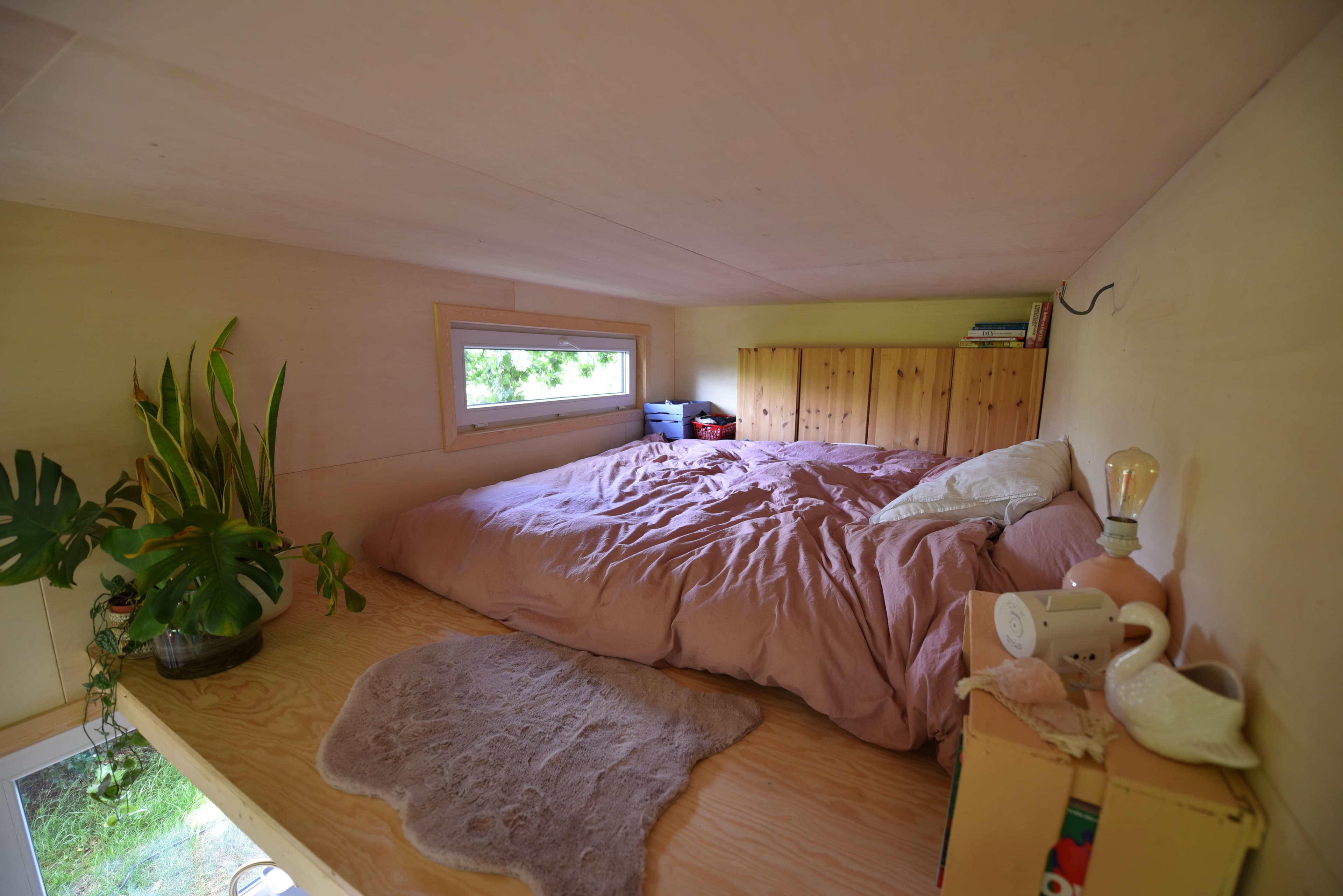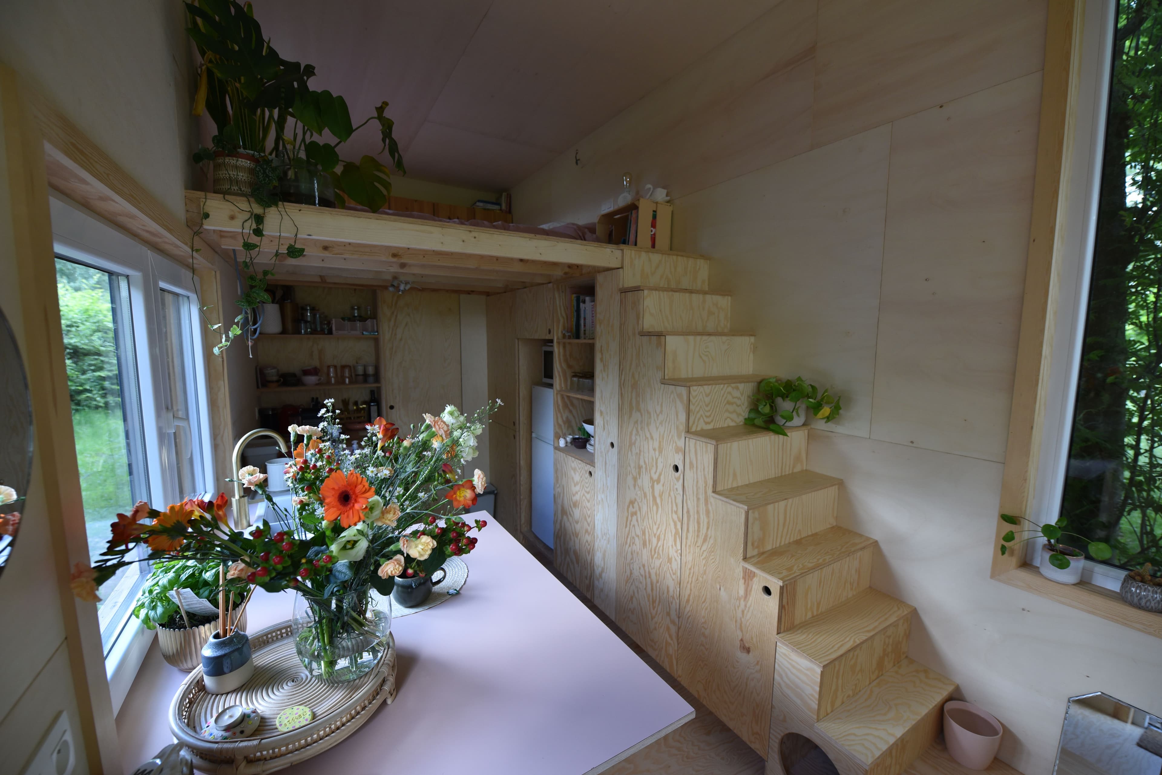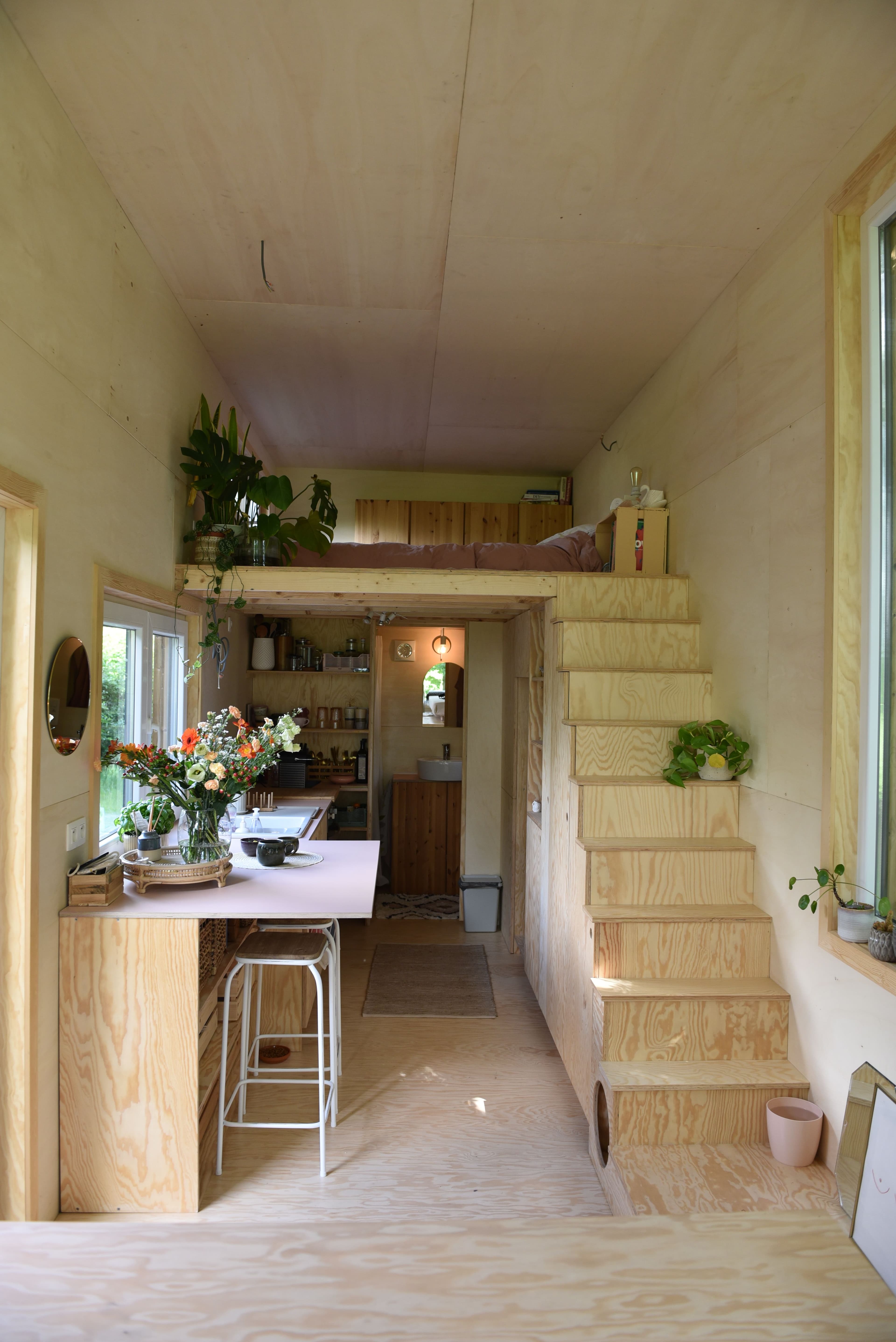 Kom binnen en kijk rond in de Tiny Model 1. Dit houten huisje op wielen neemt maar een klein stukje grond in. En toch biedt het een zee van ruimte, licht en comfort.