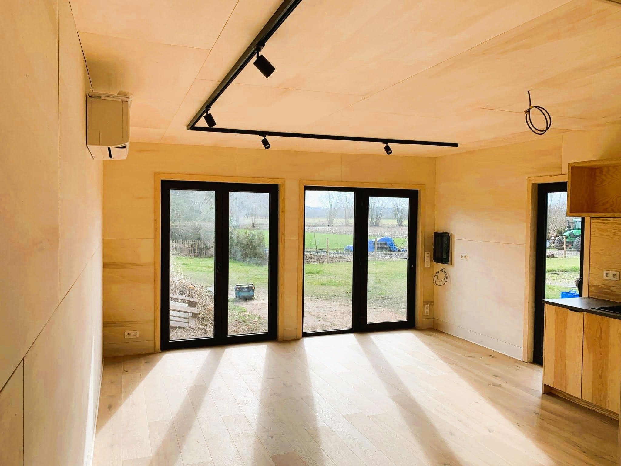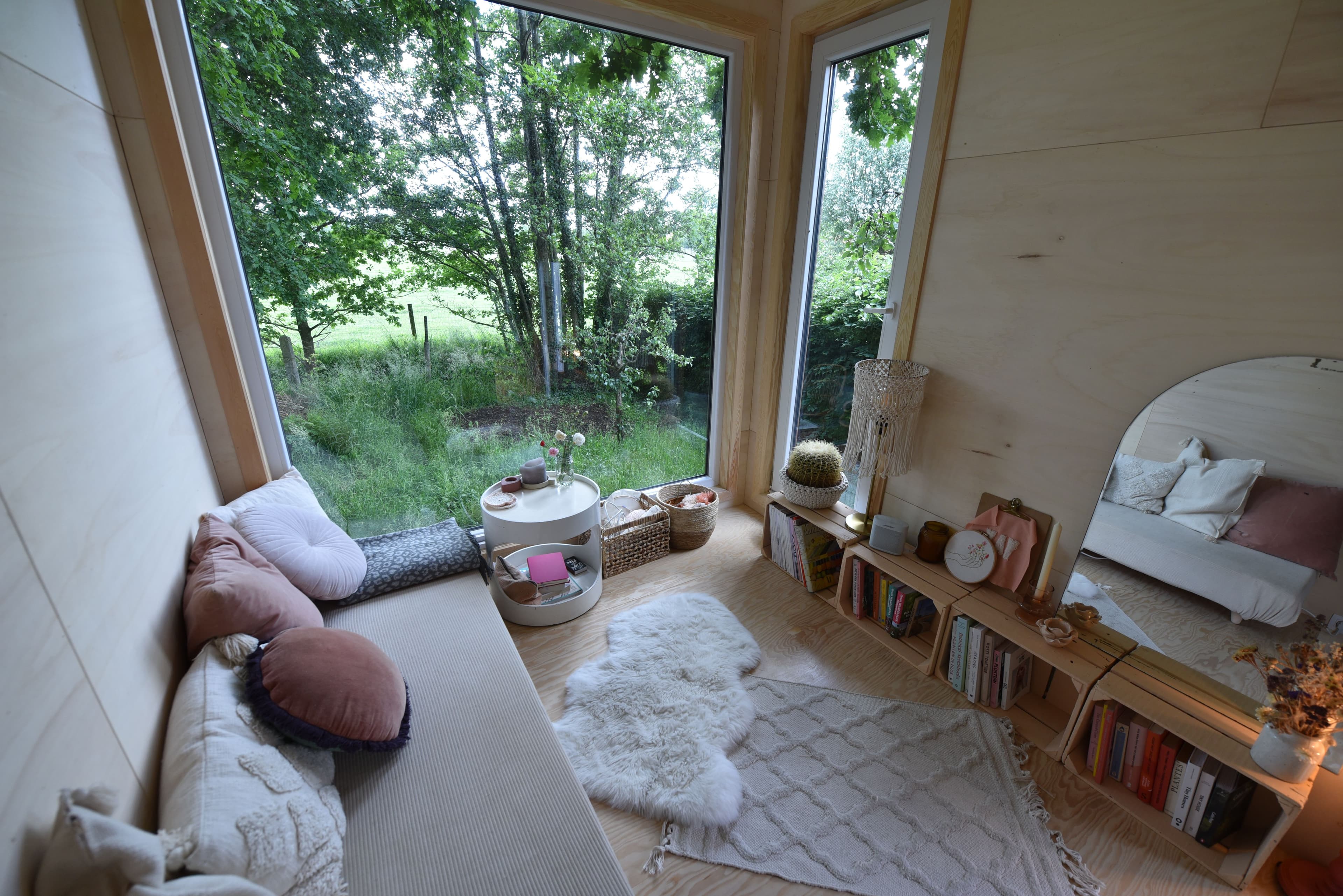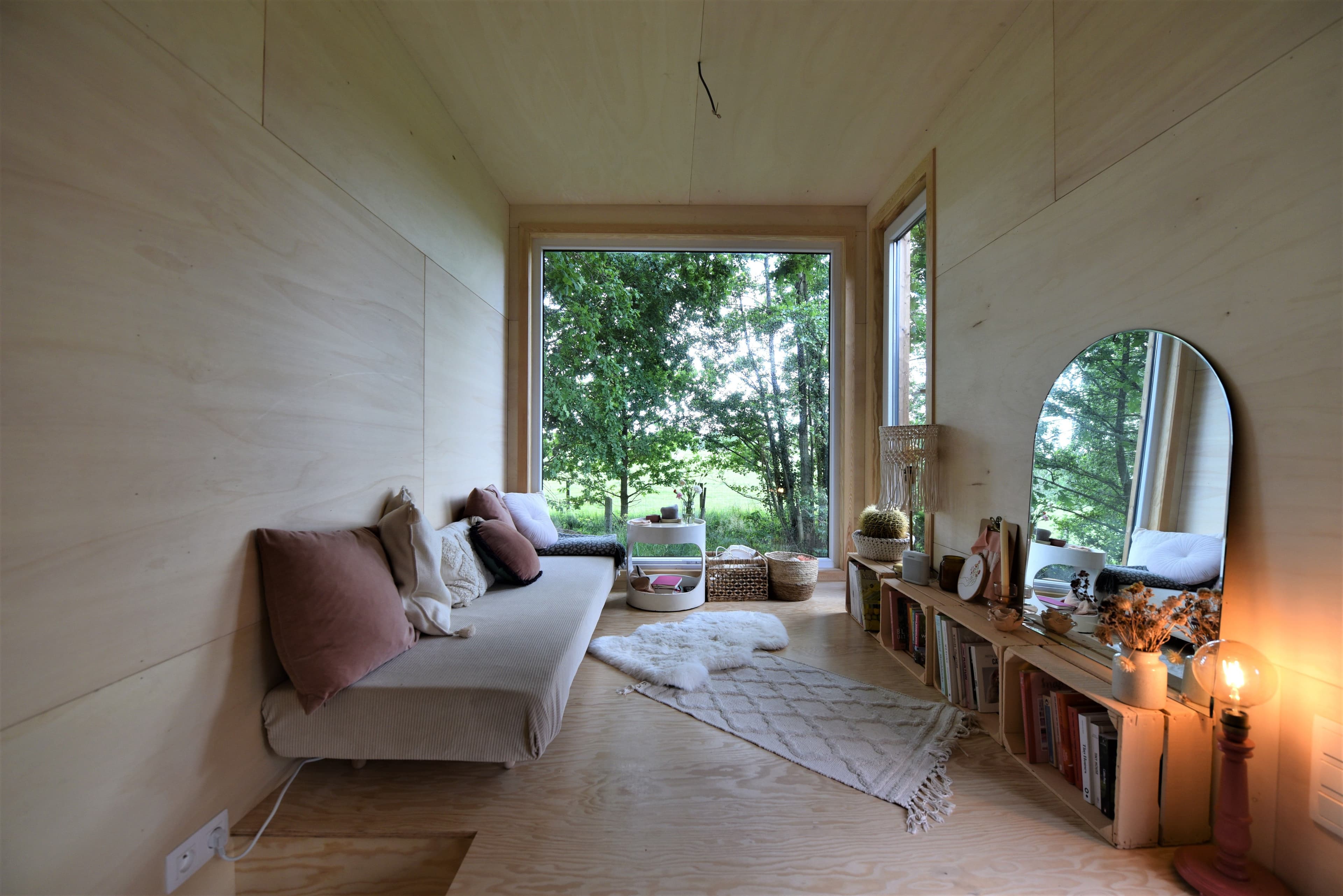 Panoramisch raam - Je tiny house heeft grote ramen zodat er veel licht binnenvalt. Vanuit de zithoek kijk je door het panoramische raam naar het groen en de vogeltjes.