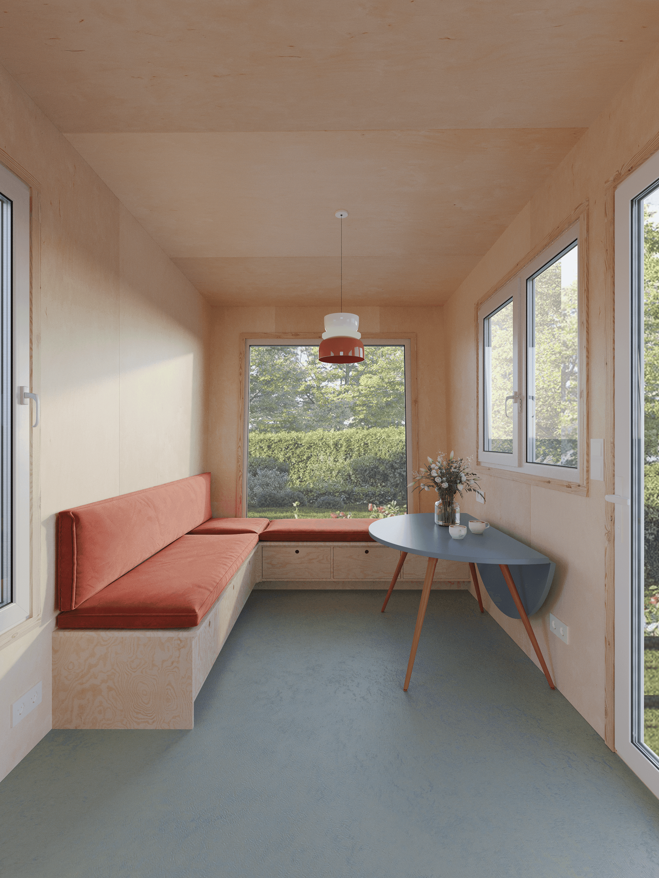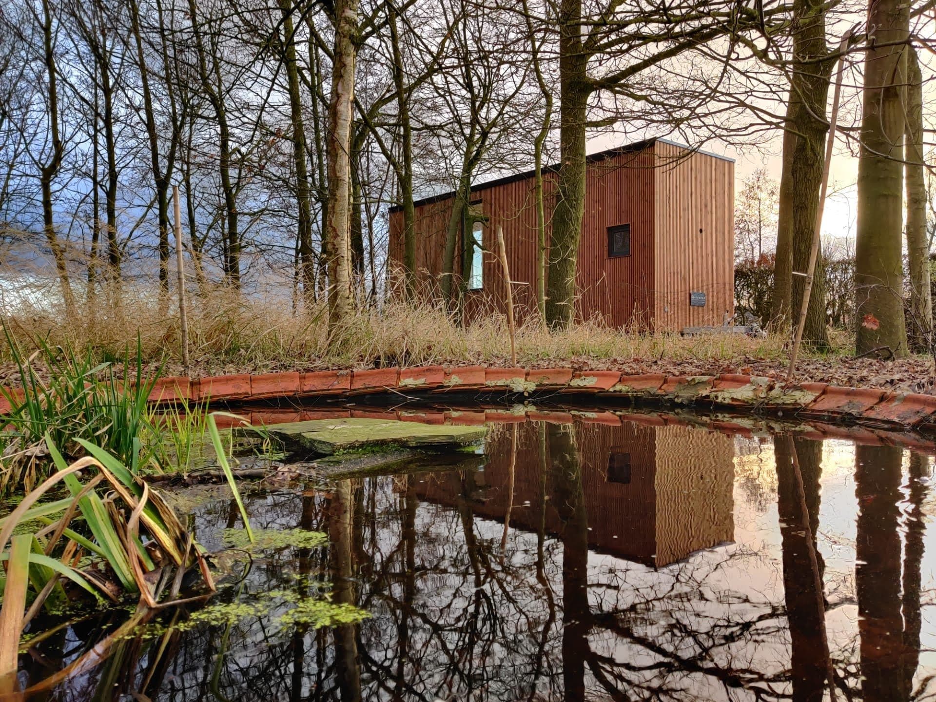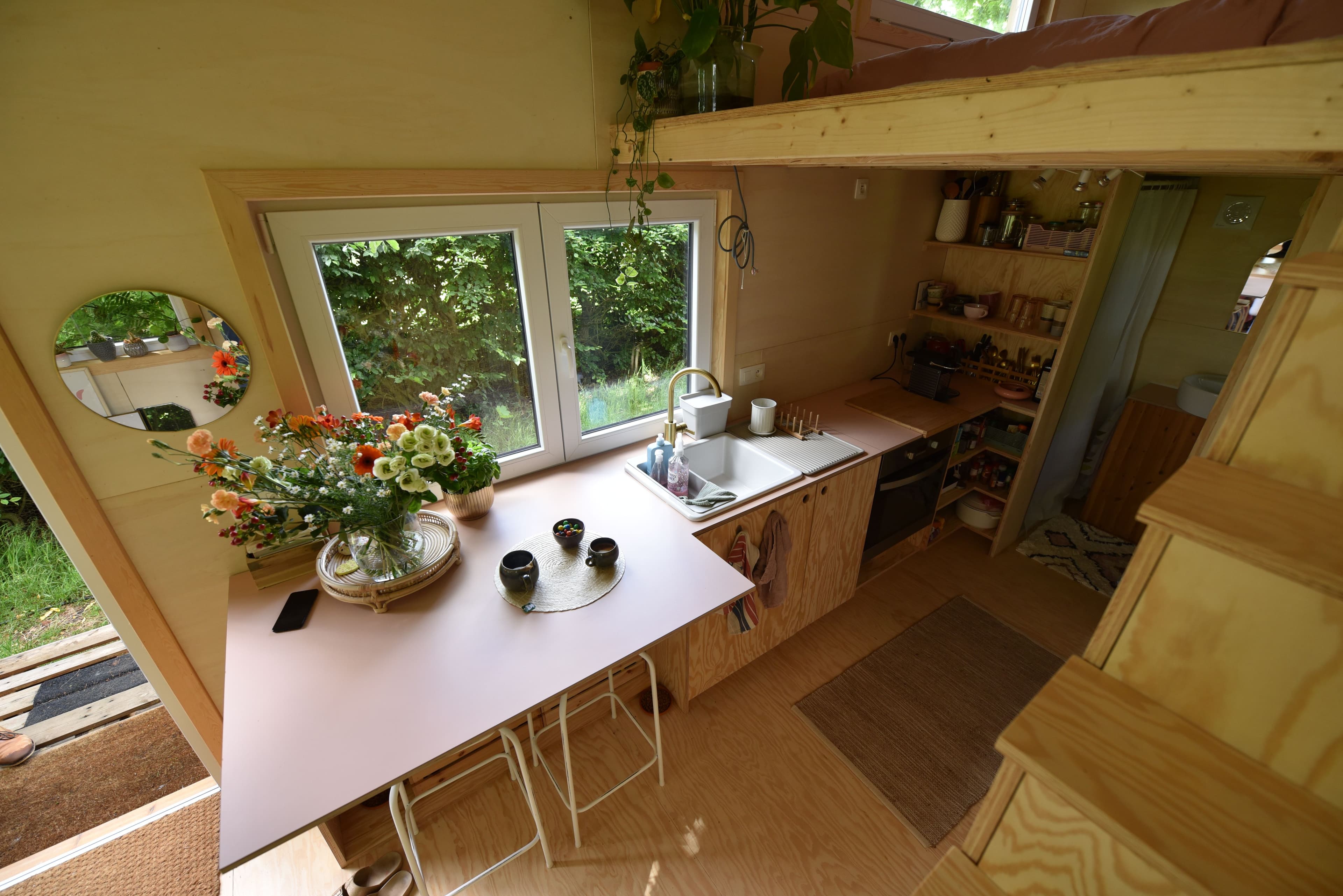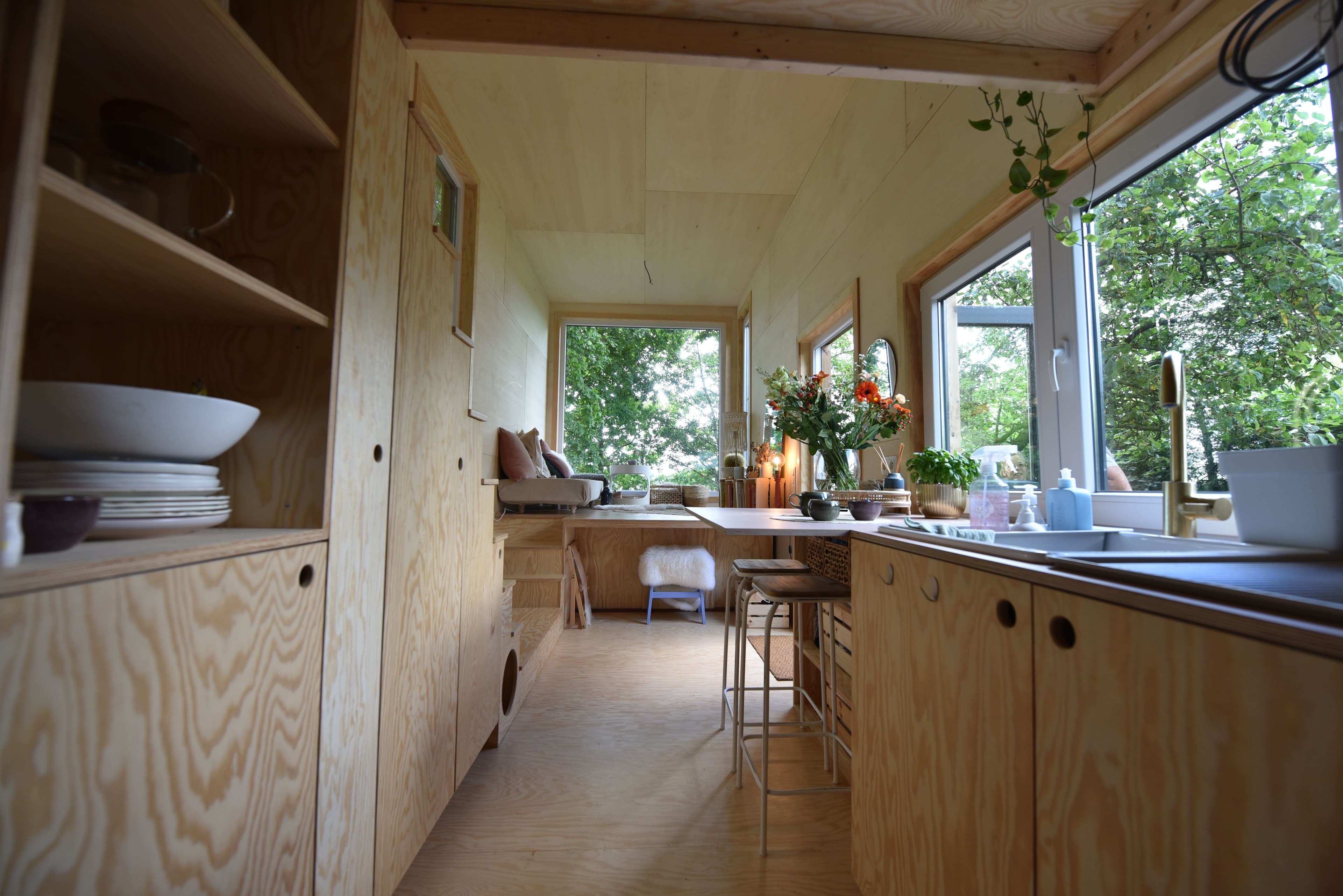 Panoramisch raam - Je tiny house heeft grote ramen zodat er veel licht binnenvalt. Vanuit de zithoek kijk je door het panoramische raam naar het groen en de vogeltjes.